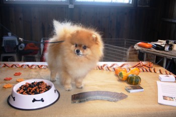 Indy stortrivdes på bordet i montern, i skålen godis i Kennel Black Orange’s färger….